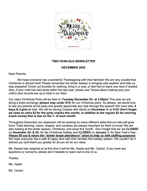Aside from that we work on our shapes, colors and toilet learning. We also work on using our manners, sharing, and self-help skills, as well as fine-motor and gross-motor. Our approach is to teach the whole child, this includes the physical, emotional, social, cognitive, and language development of the children.