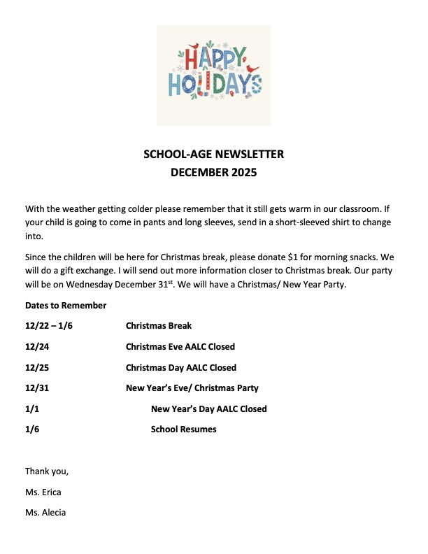 School Age Room We offer before and after school care plus summer care for school age children ages 5-13. We provide structured activities to meet the developmental needs, interests, and academic needs of the enrolled children. SCHOOL AGE NEWSLETTER December 2025